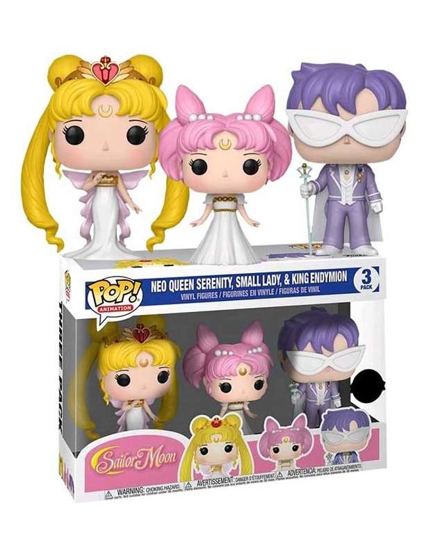 Pack de 3 figuras Funko pop de 3 de los principales personajes del anime Sailor Moon, Neo Queen ,Serenity Small Dady King Enymion, en una edición exclusiva con muy buenos acabados. Pack de 3 fantásticas figuritas que no pueden faltar en una buena colección de Sailor Moon con un tamaño de9-10cms (tamaño standar de figuras Pop) y fabricada en Vinilo.