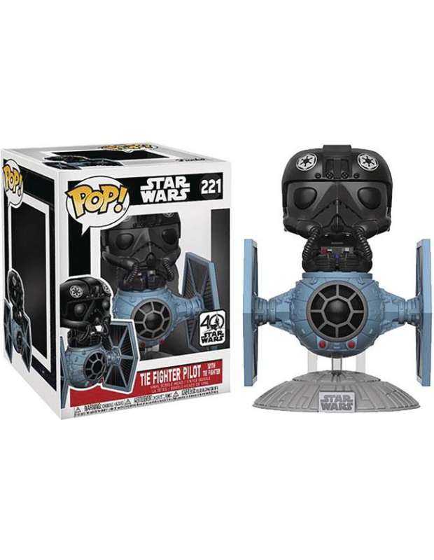 Figura Funko Pop de un piloto imperial con su navecita "Tie Fighter" de la pelicula Star Wars edición exclusiva 40 aniversario y su pegatina 40 aniversario. Figura Funko Pop fabricada en Vinilo y presentada en caja original con ventana con un Tamaño 15 cms aprox con piloto imperial montado en su nave. Figura fabricada en vinilo por Funko especialmente para la celebración del 40 aniversario de Star Wars.