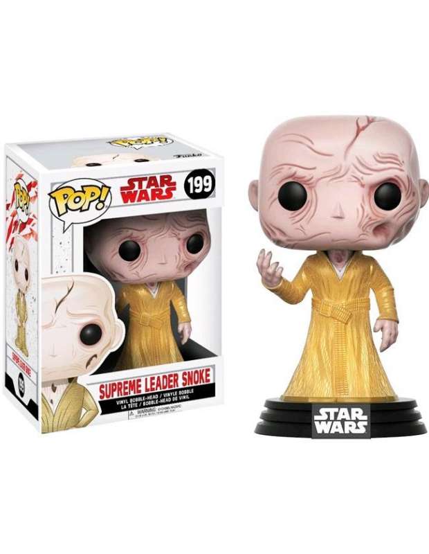 Funko pop Star Wars The Last jedi Snoke el Lider Supremo. Funko Pop de la linea Star Wars de Funko nº199 Bobble Head (Cabezón) del Lider Supremo del imperio "Snoke" presentado en caja original decorada con ventana, tamaño unos 9 - 10cms (tamaño standar de figuras Pop) y fabricada en Vinilo por Funko.
