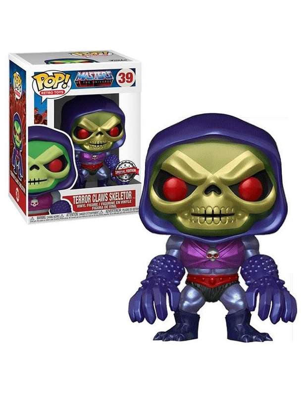 Funko Pop Skeletor Special Edition Metallic de Masters del Universo. En esta ocasión Funko nos presenta este espectacular Skeletor con las garras diabólicas "Terror Claws Skeletor" de la línea Retro Toys. Se trata de una edición especial con acabados en pintura metalizada, procedente de las tiendas Target de Estados Unidos, pero con el Sticker Special Editión europeo. Sin duda una figura única que no te puede faltar, si eres un buen coleccionista o fan de Los Masters del Universo