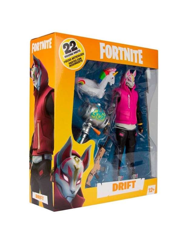 Figura Artículada con accesorios del personaje o Skin DRIFT con su máscara característica y varios accesorios en el que se encuentra el pico de bidón de plasma Slurp. La Figura Drift está fabricada por la marca Mc Farlane y tiene 18 puntos de articulación además de llevar varios accesorios de quita y pon incluidos dentro del propio blister. Artículo de merchandising Fortnite para los más entusiastas del videojuego.