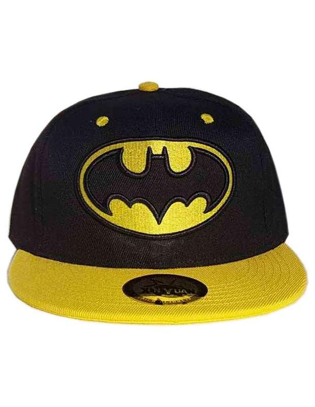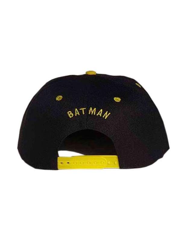 Gorra negra con visera plana amarilla, decorada con el logo de Batman bordado en su frontal y la letras Batman en la parte posterior de la gorra (también bordadas). La Gorra es de 100% de algodón y tiene multiples medidas de ajuste en la parte posterior