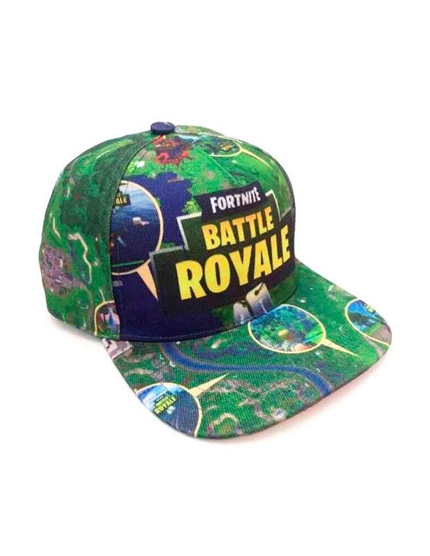 Gorra para fans del videojuego Fortnite estampada con el mapa del videojuego y el logo de Fortnite Battle Royale en la parte frontal. Se trata de una gorra con visera plana talla hombre o adolescente ( más de 14 años) realizada en poliester grueso y totalmente estampada