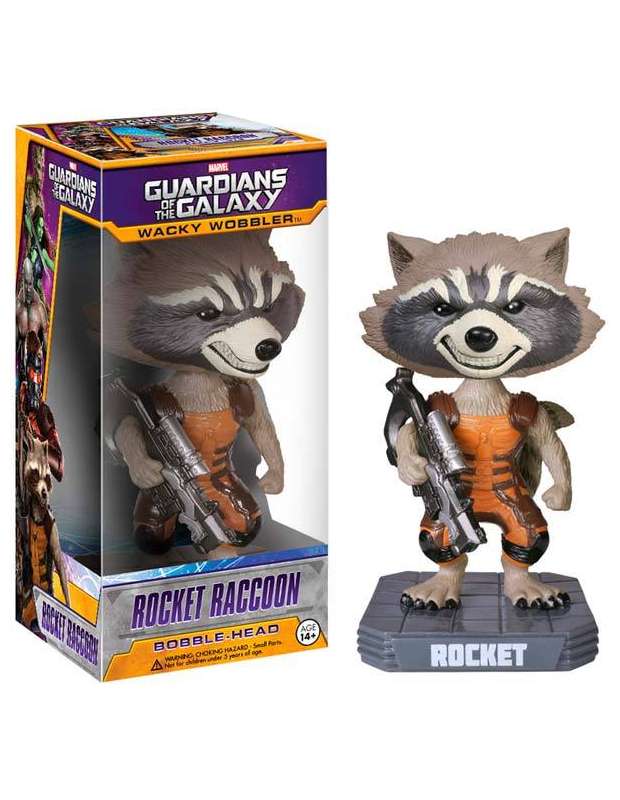 Figura Rocket de la película Guardianes de la Galaxia "Guardians of the Galaxy" de Marvel.Un cabezón de lo más original de la línea Wacky Wobbler Marvel con un tamaño aprox. de 18 cms de altura presentada en caja con ventana (Ver foto)