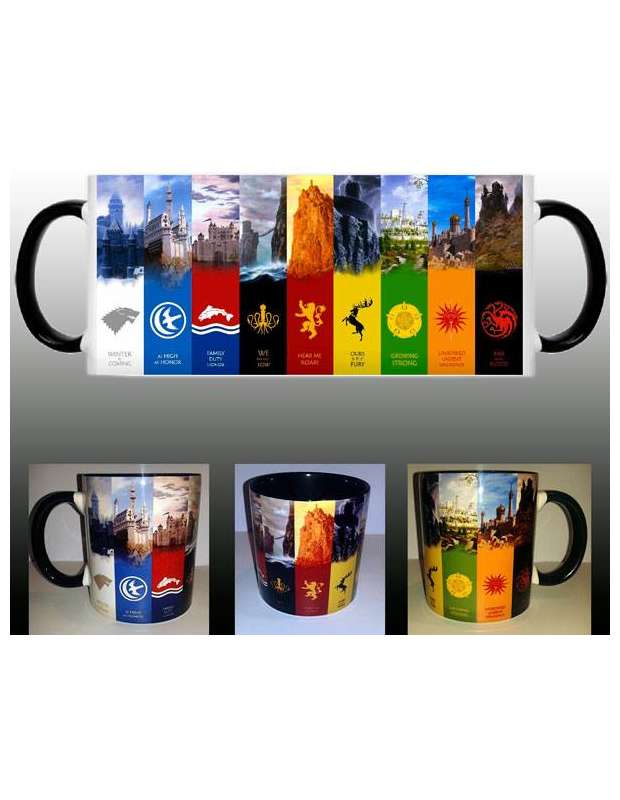 Taza Juego de Tronos Castillos de las principales casas de color negro y blanco fabricada en cerámica y resistente al lavavajillas y microondas.