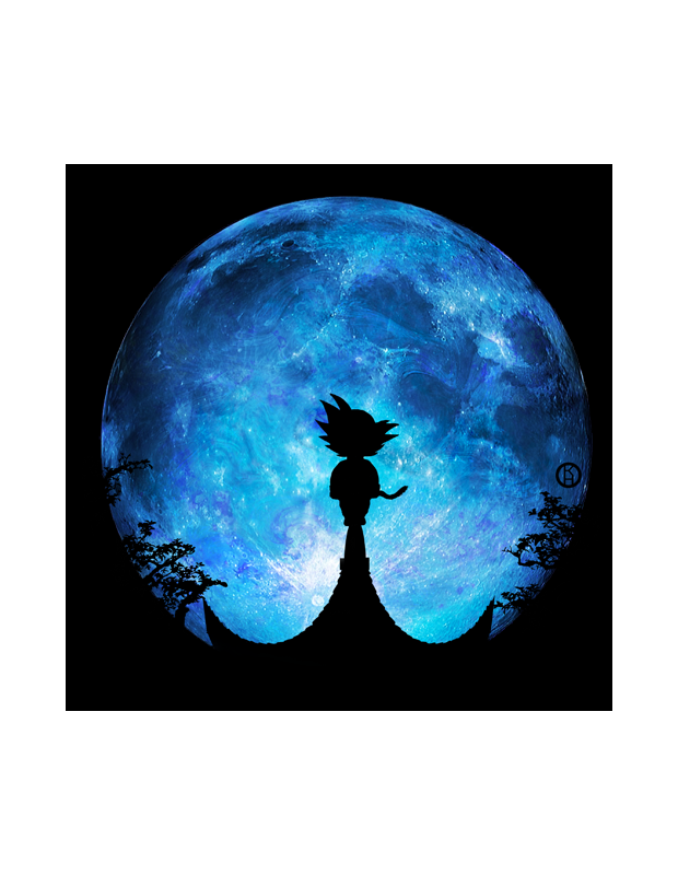 En este diseño tenemos a Goku de Dragon Ball observando quieto atentamente sobre su casa la luna llena, lo que él no sabe es lo que pasará al cabo de unos minutos observando la luna llena, Goku es un Sayan y tiene poderes tremendos cuando observa la luna llena.