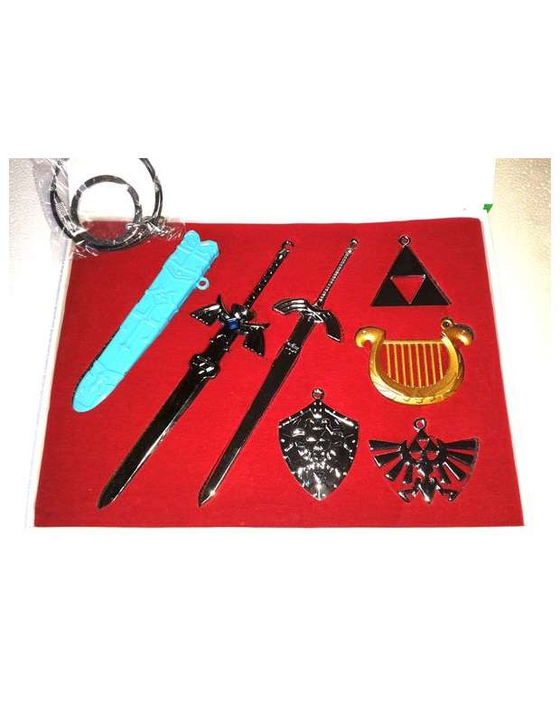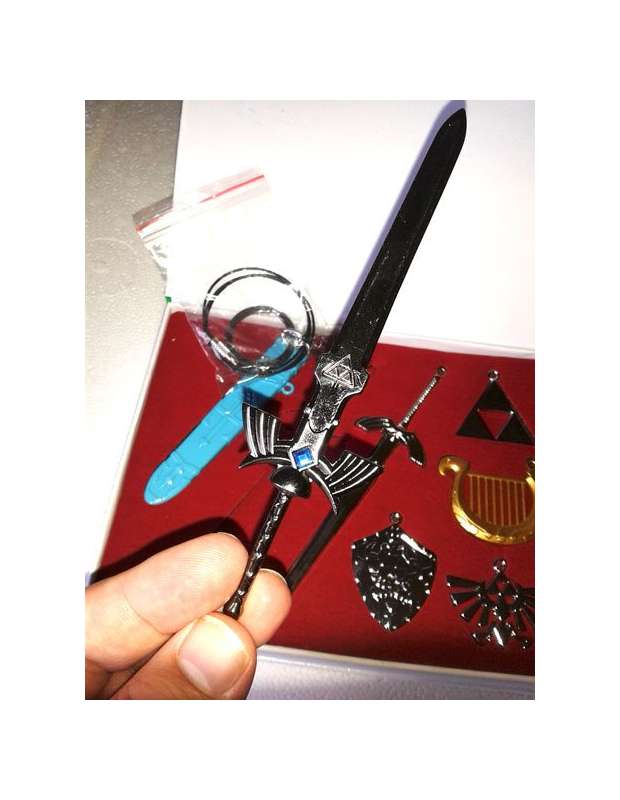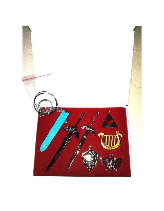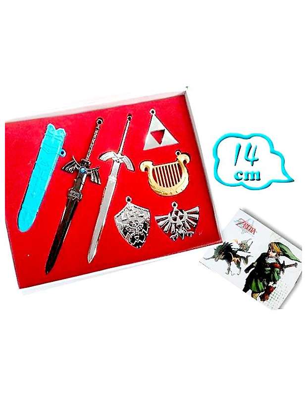 Caja con 7 piezas de merchandising de Zelda en acabado metálico, con accessorio para convertirlas en colgantes o llaveros. Las piezas son de acabado metálico y tienen una medida de 4,5cms a 13 cms y contiene espada maestra con su funda correpondiente, Arpa,escudo trifuerza y otros gadjets.