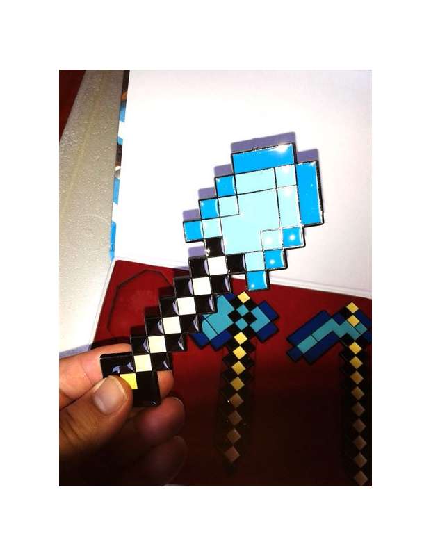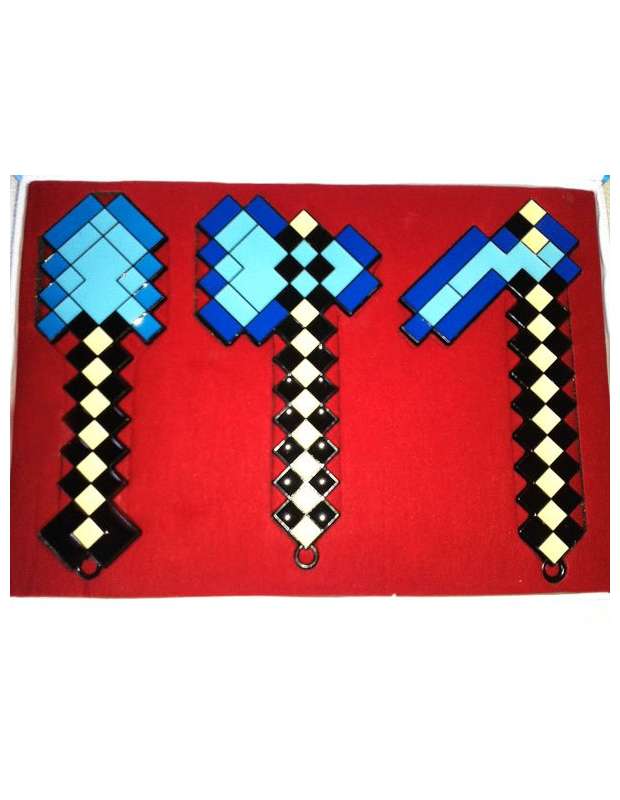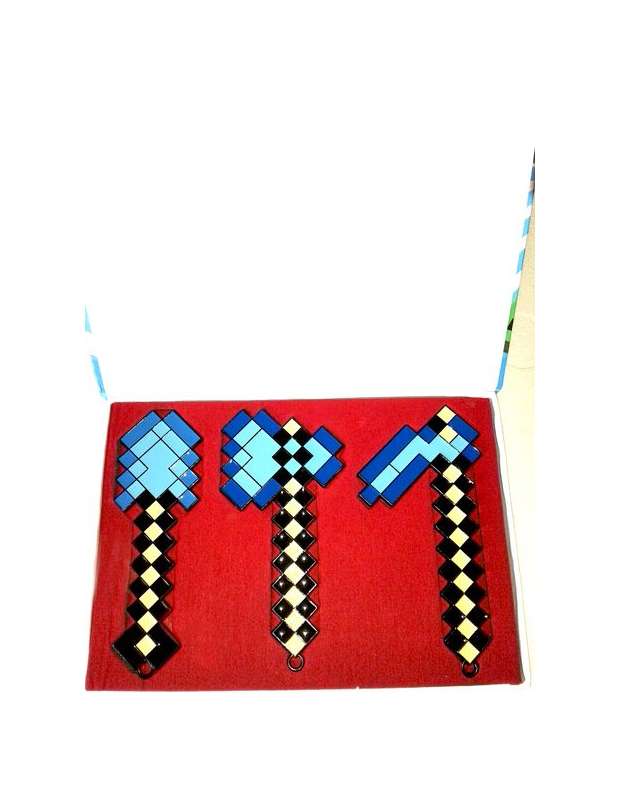 Set merchandising Minercarft de 3 armas inspiradas en el videojuego Minecraft que consta de pico, hacha, y pala, fabricadas en metal y esmalte con su caja original.