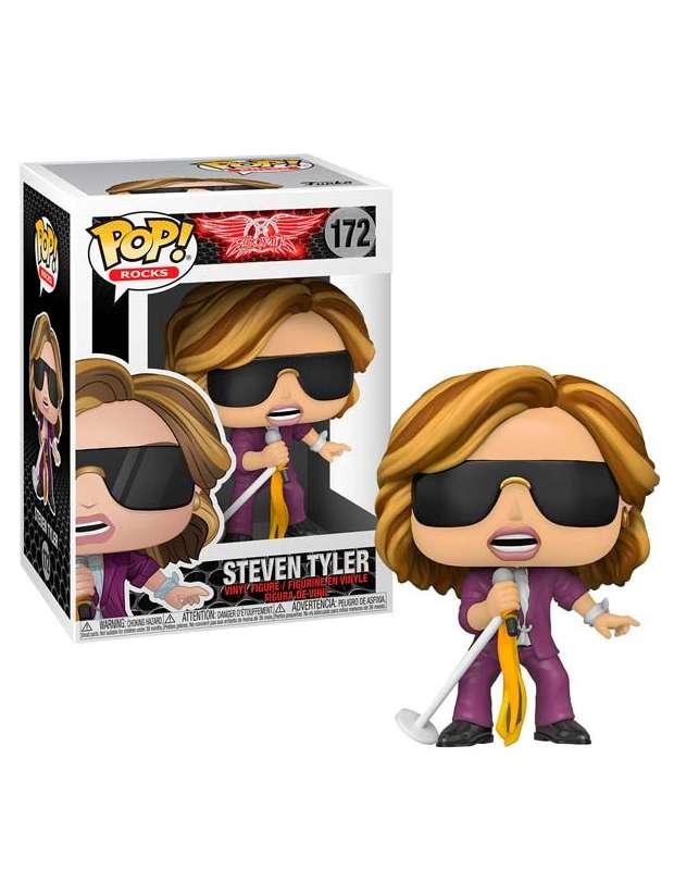 Espectacular Funko pop! de Steven Tyler del mítico grupo de Rock Aerosmith vestido con traje morado y micrófono en mano. Este Funko Pop de Steven Tyler de Aerosmith es todo un icono del Rock por lo que es muy codiciado entre los coleccionistas de los Funko Pop de Grupos de música