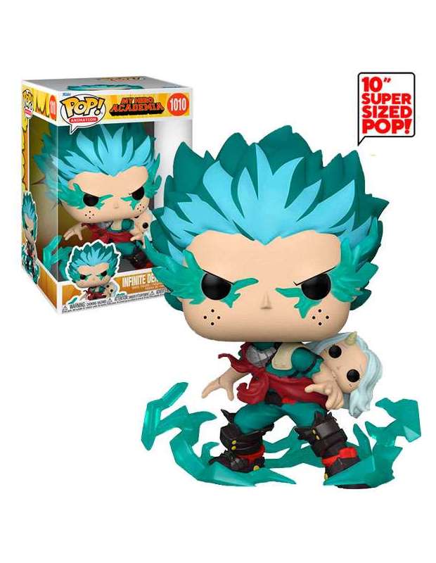 Funko Pop de Infinite Deku con Eri a cuestas de la línea Super Sized de 25 cms de altura, inspirado en la batalla final contra el poderoso villano Chisaki "Owehaul" en la que Deku libera el poder de One For All al 100% durante unos instantes. El Funko Pop de Infinite Deku with Eri luce simplemente impresionante gracias a su gran tamaño y sus rayos de energia azúl semitraslúcidos. Sin duda este es uno de los mejores Funko Pop de My Hero academia para coleccionar incluso para los coleccionistas más exigentes.
