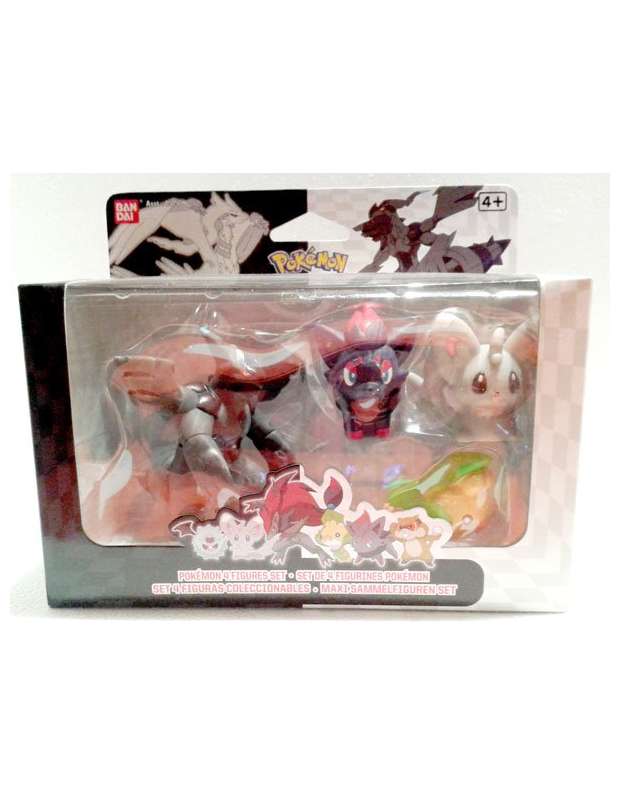 Pack de 4 figuras de pokemon que incluyen a  Zekrom (de 8 cm) y a  Sewaddle , Zorua y  Minccino (de 4 cm). Producto con licencia oficial fabricado en plástico por BanDai