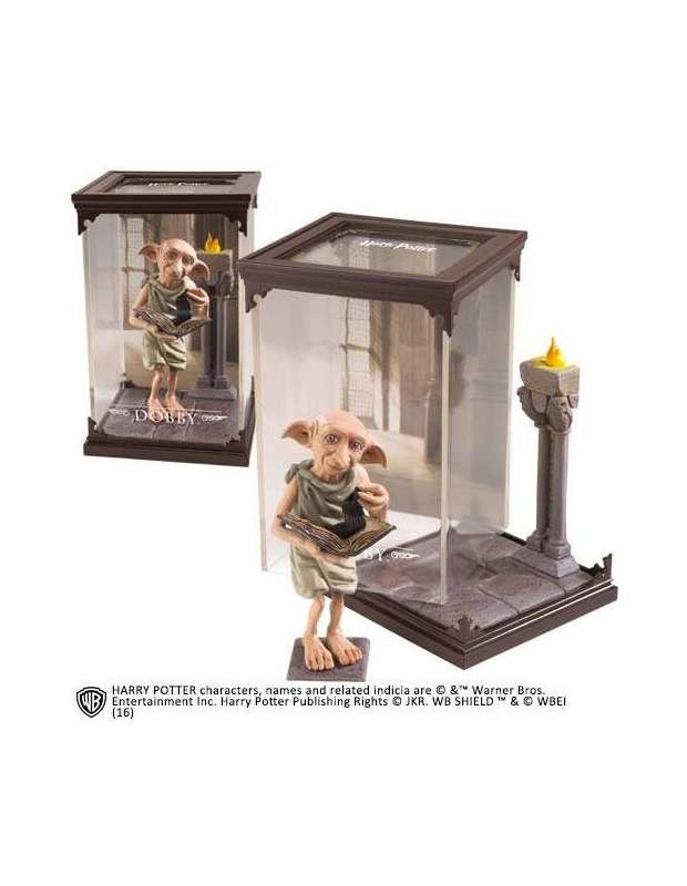 Las figuras de Noble collectión de Harry Potter están magníficamente diseñadas y pintadas cuidadosamente a mano. Tienen un tamaño de unos 19 cm de altura y tienen la particularidad de venir en una bonita urna transparente en la que se incluyen detalles del personaje para ubicarlo dentro de alguna escena de las películas de J.K Rowling a modo de un elegante diorama.Noble Collection nos presenta la fantástica criatura DOBBY que és un elfo domñestico de la familia Malfoy hasta que Harry lo liberó.