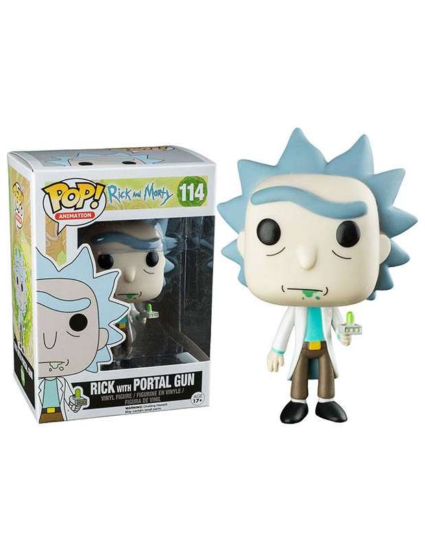 Funko pop del personaje Rick de la serie Rick y Morty con pistola de portales. Funko Pop de Rick nº114 en una edición muy limitada originalmente hecha para Hot Topic presentada en caja con ventana.Tamaño 10cms Fabricada en Vinilo 100% original.