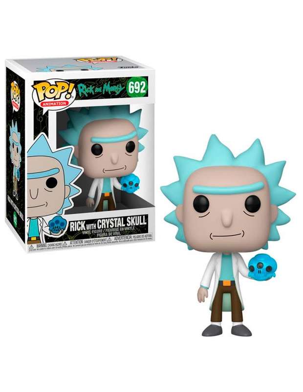 Funko Pop de Rick Sanchez de la serie de animación Rick y Morty. Es este caso Rick Sanchez lleva en su mano izquierda la calavera de cristal "Crystal Skull" de un alien de 3 ojos. El Funko Pop tiene muy buenos acabados y la calabera es de un tono azul hecha con vinilo translucido