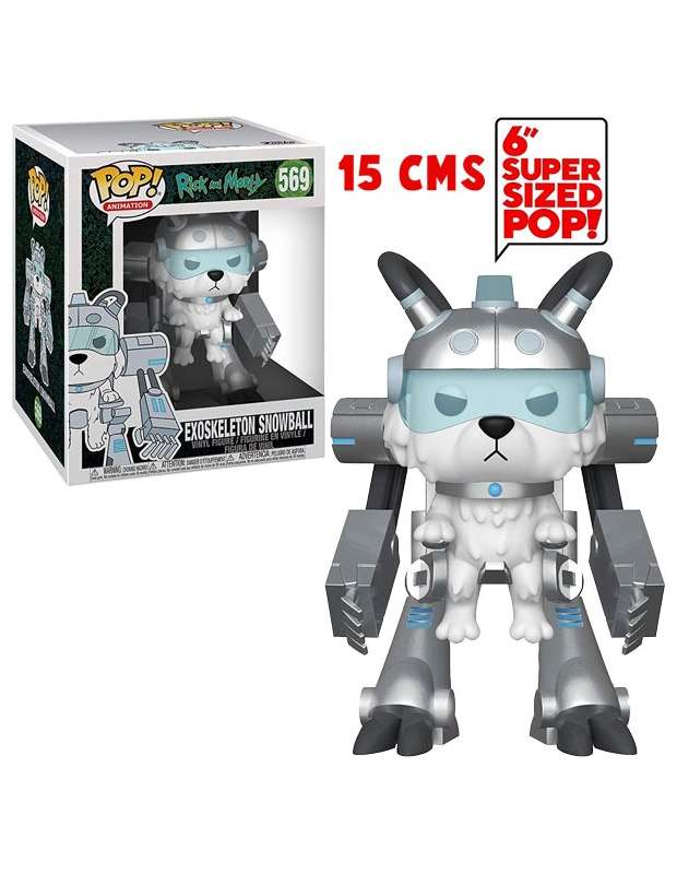 Funko Pop del perrito Bola de nieve o Snowballd con Exoesqueleto de la serie de Televisión de ciencia ficción Rick and Morty, que además lleva puesto el casco de aumentar la inteligencia, que le pone Rick Sanchez que le convierte en súper inteligente. El Funko de Snowball con exoesqueleto es de taaño supersized, lo que quiere decir que ide unos 15 cms de altura.
