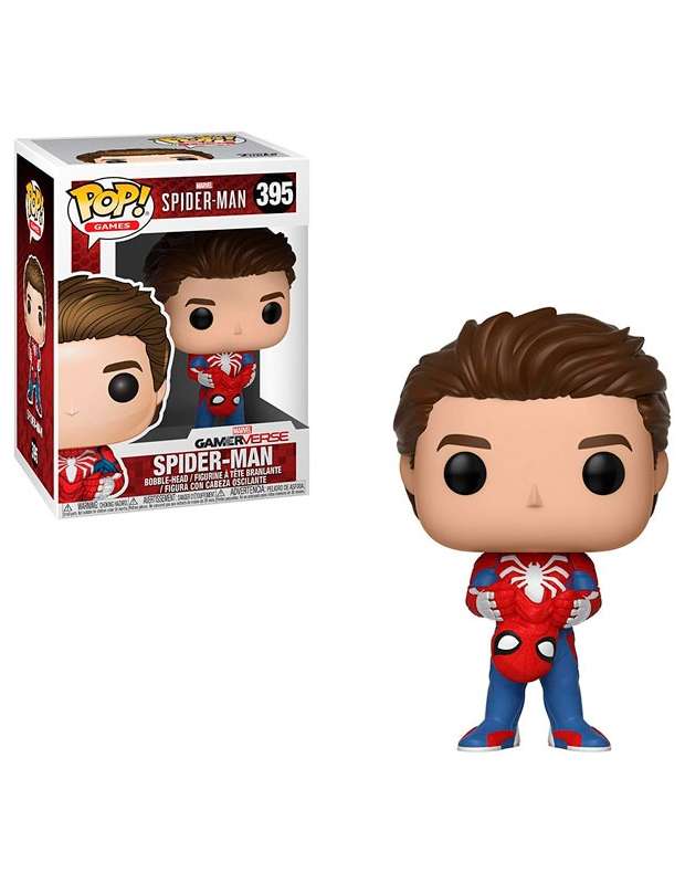 Funko Pop! de Spiderman del videojuego Gamer-Verse donde Peter Parker sostiene la máscara en sus manos. Funko Pop perteneciente a la categoría Games nº395 del estilo Bobble-head que lleva un muellecito en el cuello lo que hace que la cabeza se mueva de forma graciosa.