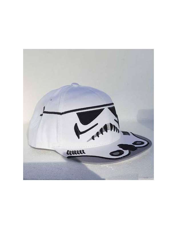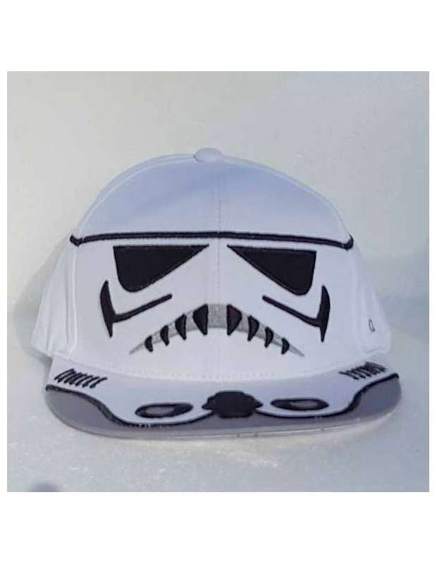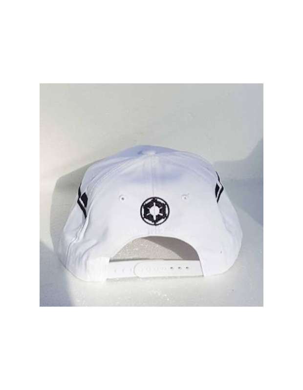 Gorra plana bordada con diseño original de un soldado imperial "Stormtrooper" de Star Wars Rogue One de color blanca y visera plana etilo snap. La Gorra es ajustable multiples medidas desde 10-12 años hasta medidas de adulto.