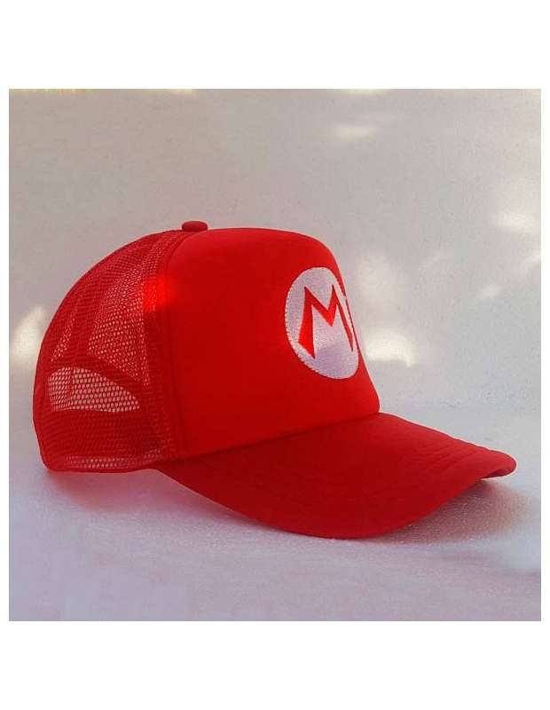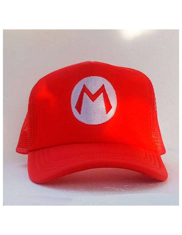 Gorra color rojo con visera estilo beisbol bordada con el logo "M" de los videojuegos Super Mario Bros. La Gorra con parte trasera en rejilla y ajustable multiples medidas desde 10-12 años hasta medidas de adulto.
