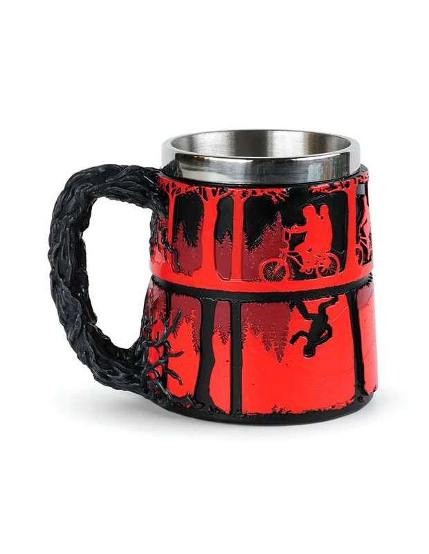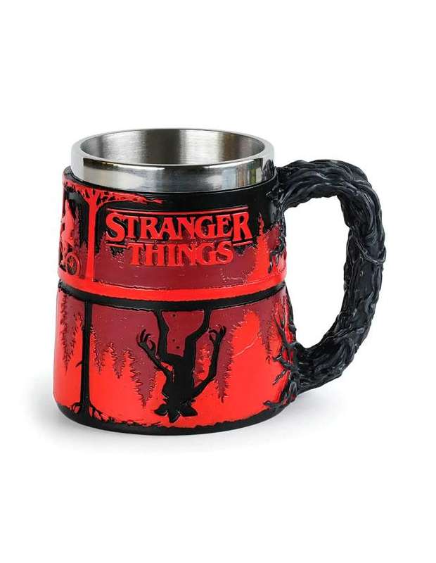 Taza Stranger Things con un diseño muy original decorada en poliresina y en relieve donde se aprecia el mundo del revés y algunos de los personajes Esta taza de Stranger Things está fabricada por la prestigiosa marca Paladone y viene en 2 partes, una aparte interior en aluminio donde poner tu bebida, que es totalmente extraible para su labado y la parte exterior decorativa. Viene presentada su caja de cartón decorada con motivos de Stranger Things.