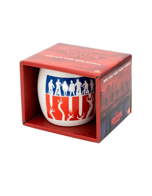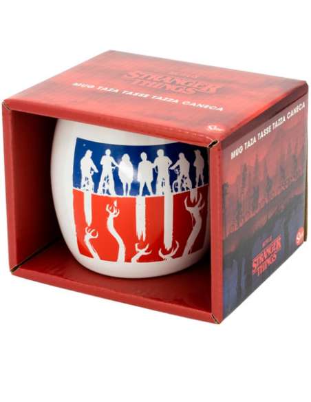 Taza Stranger Things con una capadidad de 380 ml y decorada en 2 colores con el mundo normal de color azul donde figuran algunos de los protagonistas y el mundo del revés en color rojo con garras de Demogorgon. Esta taza de Stranger Things está fabricada en cerámica y viene presentada su caja de regalo ilustrada como se ve en las fotos del producto. Por lo que la hace aducada para decoración o para usar con tu desayuno favorito,