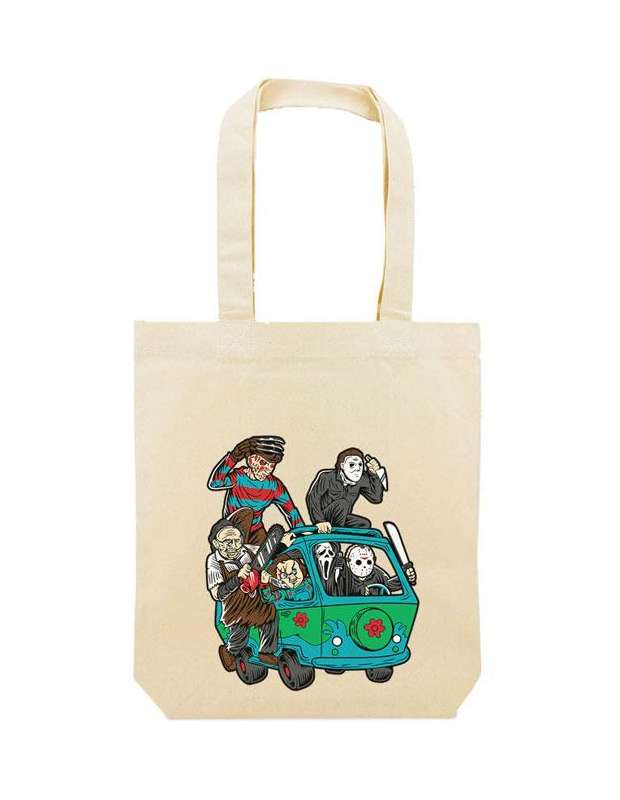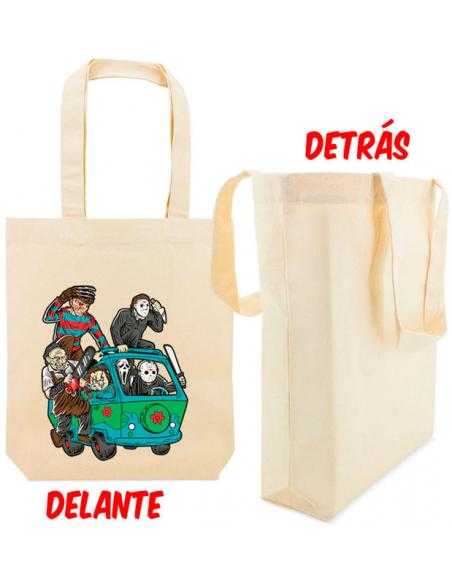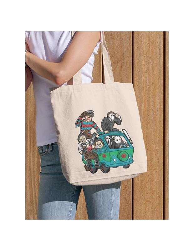 Tote Bag estampada con varios de los personajes de peliculas de Terror más famosos montados en la furgoneta de Scooby Doo. Espectacular diseño estampado sobre tote bag con fuelle donde aparecen Freddy Krueger, Chucky, Matanza de Texas, Ghostface de Screem, Jason Voorhees y Michael Myers. Este Tote Bag no va a dejar a nadie indiferente y es ideal para regalar en fechas señaladas como Halloween y fans del cine de terror